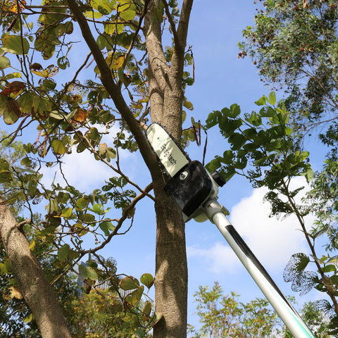 On a powered pole saw, the exposed blade length represents your maximum cutting capacity. If, for instance, you have a 7” saw bar with 6” exposed, you can only saw branches 6” and under with a single pass. As a rule of the thumb, pick a bar length greater than the thickest branches you plan to cut. In general, try to go for powered pole saws with at least 8” of total bar length. Longer cutting bars are effective for the thickest branches. If you usually deal with thin branches, opt for a shorter bar.